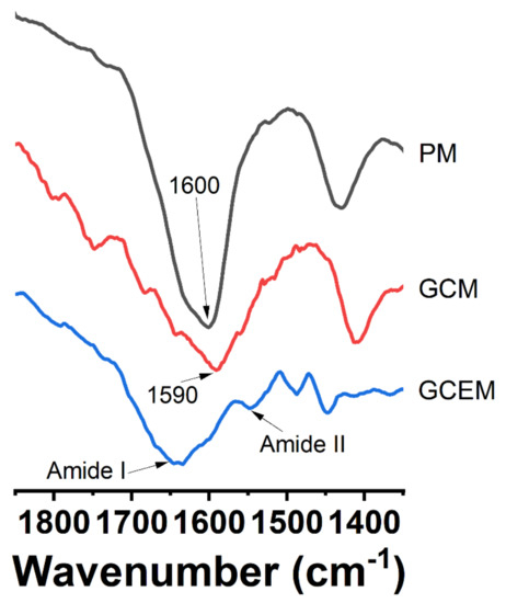 During gelatin coating, pectin-gelatin complexes were formed at the surface of the microspheres. The carboxyl group of pectin and amino groups of gelatins contribute to the formation of these complexes (as shown in Scheme 3). When it comes to EDC catalysis, amide bonds are formed predominantly between the carboxyl groups of pectin and the amino groups of gelatin. Figure 6 shows the ATR-FTIR spectra of the three samples throughout the various processing stages (the full spectrum is shown in Figure S1). Regarding the calcium-pectin microsphere spectrum, the broad peak around 1600 cm−1 is due to COO− groups, while the peak at 1734 cm−1 is due to the carbonyl groups of the methylated portions [28]. When it comes to the gelatin-coated microsphere spectrum, characteristic peaks of both pectin and gelatin can be observed. The broad peak around 1590 cm−1 is attributed to the COO− of pectin and amide I and II regions of gelatin (1628 cm−1 and 1528 cm−1, respectively). Upon EDC catalysis, the amide I and II regions became more pronounced, as shown in the spectrum, which can be explained by the formation of amide bonds (changes in N-H bending and C=O stretching).