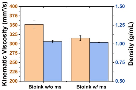 The kinematic viscosity and density of bioink with and without gelatin-coated pectin microspheres did not show a significant change (Figure 7). Because of the Pluronic® F-127, the viscosity of the bioink is temperature-dependent. The temperature-dependency can be beneficial when it comes to bioprinting applications. At 4 °C, the kinematic viscosity for bioink without and with microspheres was 352.09 ± 9.41 mm2 s−1 and 315.45 ± 6.61 mm2 s−1, respectively, a 10.40% decrease upon the incorporation of microspheres. Increasing the temperature to 20 °C, the kinematic viscosity for bioink without and with microspheres was 421.68 ± 4.32 mm2 s−1 and 376.83 ± 0.76 mm2 s−1, separately (10.64% decrease). The density for bioink with and without microspheres was 1.030 ± 0.017 g/mL and 1.020 ± 0.006 g/mL, respectively, a 0.99% decrease.