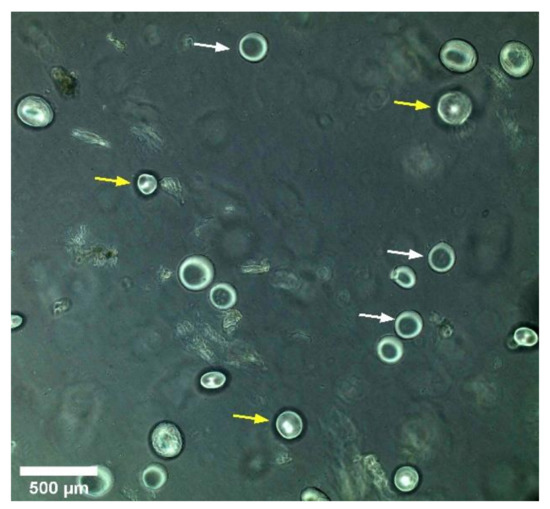 Microsphere distribution within bioprinted scaffold. Both focused (white arrow) and unfocused (yellow arrows) microspheres are depicted.