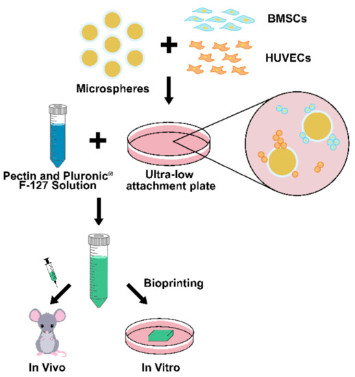 This study aims to develop a novel bioink that incorporates gelatin-coated pectin microspheres with the potential to promote vascularization and controlled release of bioactive compounds. As shown in Scheme 1, gelatin-coated microspheres can be incubated with HUVECs (for vascularization) and functional cells, such as bone marrow mesenchymal stem cells (BMSCs). Microspheres/cells can be incorporated into the bioink for scaffolding. To keep the overall scaffold composition simple, pectin-based microspheres were chosen because pectin is also the major component of the base bioink developed previously. Pectin is primarily a linear polysaccharide found in the cell walls of plants, and it is comprised mainly of α-(1-4)-linked D-galacturonic acid residues with interspersed 1, 2-linked L-rhamnose residues [10]. Divalent ions (such as Ca2+ and Ba2+) cause crosslinking throughout the pectin molecules and allow hydrogel spheres to form from droplets through the formation of shifted “egg-box” structures when crosslinking low methoxyl (LM) pectin [11]. Pectin-based hydrogel systems have been used in drug delivery and tissue engineering applications, including the development of artificial red blood cells, due to their biocompatibility and biodegradability [12].