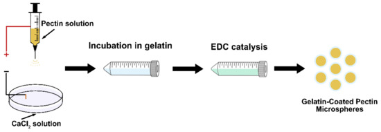 As shown in Scheme 2, the collected microspheres (calcium-pectin) were incubated in 0.5–2% (w/v) gelatin solutions for 15 min and rinsed twice in DI water. The microspheres were incubated overnight in EDC in MES buffer (15 mg/mL, pH = 4.8) at 4 °C. Microspheres were rinsed with DI water and placed in phosphate-buffered saline (PBS) for analysis under an inverted microscope (EVOS XL; Thermo Fisher Scientific, Waltham, MA, USA).