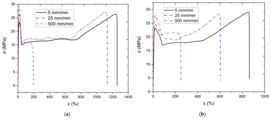 Tensile test at different test speeds: (a) compression-molded sample, (b) injection-molded sample.