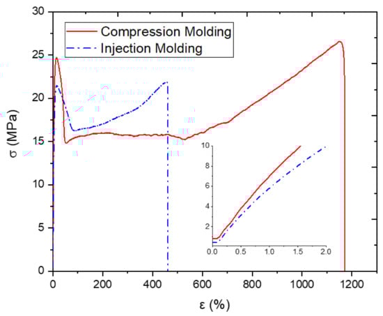 The mechanical behaviors of samples fabricated by both compression and injection molding will first be investigated. Figure 2 shows the tensile tests conducted on the samples processed using injection molding and compression molding. This figure also shows an insert of the same data at low strain values, less than 2% strain, to better observe the difference in elastic modulus. The mechanical response of both samples may be divided into four distinct deformation phases.