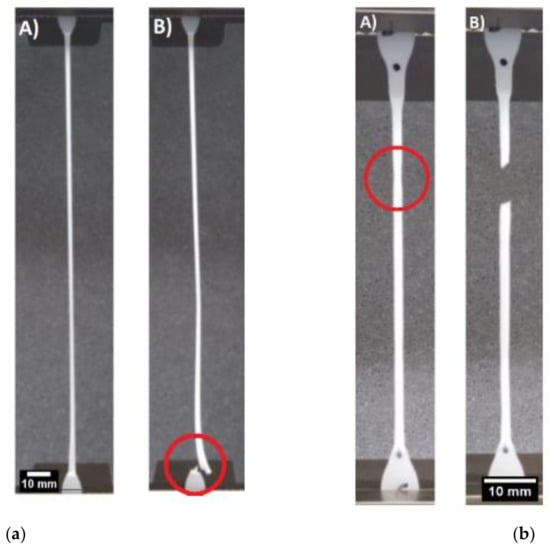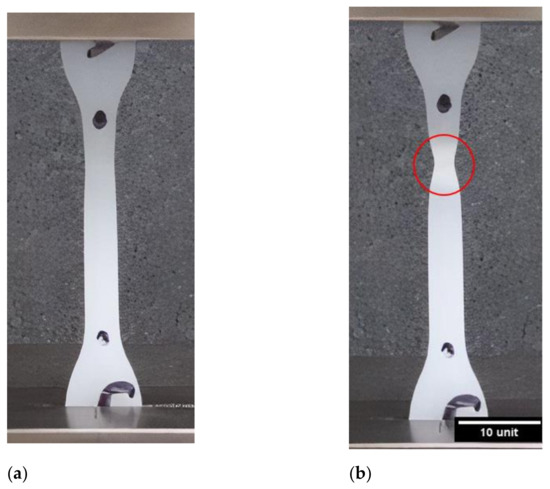 (a) Initial state of the tested sample, (b) start of the necking phenomenon during tensile testing.