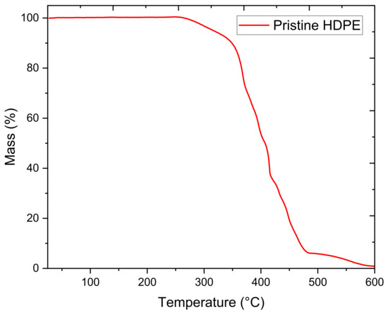 A thermogravimetric analysis (TGA) test was carried out using a Q-50 Thermogravimetric analyzer (TA Instruments Inc., Newark, DE, USA) to evaluate the thermal stability of HDPE samples. The sample was heated in a controlled atmosphere with a heating rate of 10 °C/min until reaching 600 °C, under a flow of N2 gas at a rate of 60 mL/min. The weight history was plotted to assess the thermal stability of HDPE at each temperature [39,40].