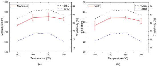 The correlation between the mechanical properties of HDPE and the degree of crystallinity is further illustrated in Figure 6. The Young’s modulus and degree of crystallization are plotted against the temperature change, and a similar graph is constructed for the yield stresses. This analysis was done by varying the processing temperature of the samples and then using DSC and XRD to determine the degree of crystallinity for only compression-molded samples. The correlation becomes evident and shows that the degree of crystallinity obtained from both DSC and XRD increases along with the specimen’s modulus and yield stress.