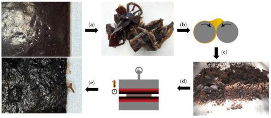 (a) Cured compound turned into waste; (b) transfer of waste to two roll mill for the mastication process; (c) coarse granulate after mastication; (d) transfer to manual hot press for recycling; (e) recycled compound.