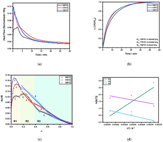 Kinetics and curing parameters derived from isothermal DSC analysis of CR/TLP 2%: (a) heat flow vs. time at temperatures at 160 °C, 170 °C and 180 °C; (b) degree of cure calculated; (c) autocatalytic model fitting for the domains of Reaction 1 (R1), Reaction 2 (R2) and Reaction 3 (R3); the indices from 1 to 8 are related to the fitting parameters reported in Table S1; (d) activation energy, Ea, and pre-exponential factor k0 obtained from the slope and intercept values, respectively, of the linear regression, in solid lines, for three distinctive reactions occurring during curing.