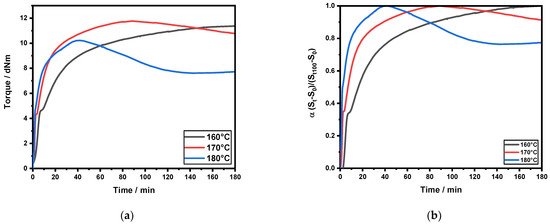 The curing behavior for each compound was determined using a Monsanto Moving Die Rheometer (MDR) 2000, with the lower die moving at 1.66 Hz. Each analysis was performed at temperatures of 160 °C, 170 °C and 180 °C for 3 h. The degree of cure was determined for each temperature using the following Equation (1):