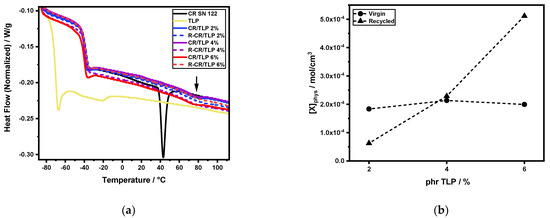 Dynamic DSC analyses, reported in Figure 4a, show that the Tg values reported in Table 6 are shifting in the cured compounds to slightly higher temperatures compared to the Tg of CR, and even higher Tg values are obtained from recycled compounds. The temperature of crystallization, Tc, is higher in the cured compounds compared to CR, and it is even higher in recycled compounds, but it decreases with increasing concentrations of TLP.