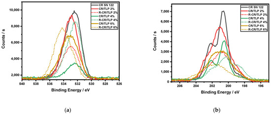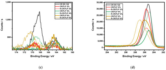 XPS data comparison between CR SN 122, TLP, cured compounds and recycled compounds: (a) O 1s spectra; (b) Cl 2p; (c) S 2p; (d) C 1s.