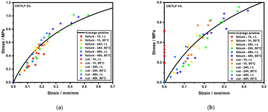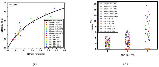 Tensile testing of cured compounds show the initial cured behavior is promising. CR/TLP 2% has an average maximum tensile strain of 16.2 and an average maximum tensile strength of 22.4 MPa; CR/TLP 4% showed an average maximum tensile strain of 10.7 and an average maximum tensile strength of 11.7 MPa; while CR/TLP 6% showed an average maximum tensile strain of 7.3 and an average maximum tensile strength of 5.6 MPa. There is a large reduction in UTS and fracture strain for all of the healed samples. Figure 6a–c for healed compounds (CR/TLP 2%, CR/TLP 4% and CR/TLP 6%, respectively) show that deliberately cut, healed compounds consistently recovered better than those that underwent a previous tensile test to failure. Figure 6d shows that higher healing efficiencies are obtained as the concentration of TLP, the healing time and healing temperatures increase. We found that 47% of the CR/TLP 2% that were healed after failure samples did not have any residual strength after healing. In addition, 33% of the results were obtained from samples healed at r. t., while only 20% of the healed at 80 °C could be tested. The highest healing efficiency was obtained after 24 h of healing at 80 °C (maximum 3.1%, average 1.8%). All of the CR/TLP 2% healed after cutting samples gave stress–strain curves and the highest healing efficiency was obtained after 24 h of healing at 80 °C (maximum 4.5%, average 3.9%). CR/TLP 4% shows a better behavior for the healed after failure samples as the percentage of not tested specimens was lower, at 23%, while 33% of the samples were tested after healing at r.t. and 44% after healing at 80 °C. The highest healing efficiency in this case was obtained after 48 h of healing at 80 °C (maximum 5%, average 2.3%) but the highest average value was obtained after 24 h at 80 °C (maximum 4.4%, average 3.0%). The healing after cutting of CR/TLP 4% did not give significant results for 10% of the samples, but only after healing at r.t., while all the samples healed at 80 °C performed well giving the highest healing efficiency after 24 h at 80 °C (maximum 6.5%, average 5.6%). We found that 93% of the CR/TLP 6% samples healed after failure did not heal, as only two samples were tested after healing at r.t. after 1 h and after 24 h and the healing efficiency value obtained was equal in both cases: 2.6%. The performance of healed samples after cutting was better, as only 23% of the samples, all healed at r.t., were not tested. The highest healing efficiency was obtained after 24 h at 80 °C (maximum 13.4%, average 12%).