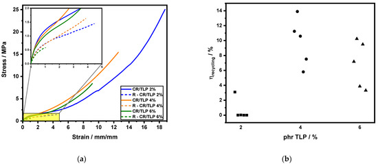 The cross-link density calculations, reported in Table 7, highlight an increase in recycled compounds, with increasing concentration of TLP, as shown in Figure 4b. In CR/TLP 2%, the amount of cross-linking points is probably too low, so during recycling only weak chemical interactions are restored and not enough entanglements are generated to compensate the amount of lost permanent covalent bonds.