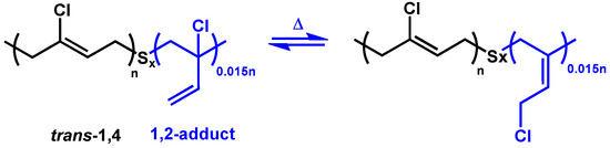 The chemical structure of CR gives the rubber its very useful properties. These make it suitable for applications where a resistance to extreme environments including highly oxidative chemistry, organic solvents, oils and high temperatures is required [3]. This is possible thanks to the vinylic position of the chlorine atom in the repeating trans-1,4 units for the majority of the double bonds in the network, as it inactivates the double bond by creating a strong dipole through the inductive effect, and thus making it less keen to participate in oxidation reactions. However, to justify the cross-linking process, previous researchers have proposed a reaction mechanism involving a small amount of defects in the raw material in the form of 1,2-adducts formed during emulsion polymerization of CR [5]. These are believed to undergo isomerism which, under specific conditions, transposes the chlorine atom to a less sterically hindered position as shown in Scheme 1, a necessary rearrangement in order to have a reactive substrate [6].