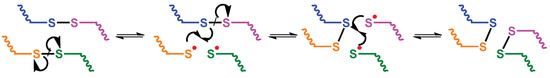 Disulfide metathesis-based intrinsic self-healing mechanisms have been widely implemented for diene-containing elastomers thanks to their ability to break and reform through a wide range of stimuli, such as chemical triggers including both redox [9] or alkaline environments [10], or they can be physically induced, for example by controlling their temperature [11] or through exposure to light [12]. It has also been demonstrated that the dynamic cleavage and reforming of the labile disulfide bond can occur spontaneously [13]. Nevejans et al. demonstrated that in absence of chemical triggers the radical-mediated [2 + 1] mechanism, as shown in Scheme 2, is followed during the cleavage of the disulfide bond and its subsequent reforming [14].