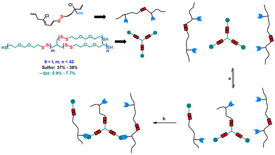 General structure of Thiokol LP-3; (a) proposed initial interaction through disulfide metathesis between CR and TLP during mixing on the two roll mill; (b) proposed cross-linked structure obtained through thermally initiated thiol-ene reaction between the thiol groups, -SH, of TLP and the double bond of the 1,2-adduct of CR.