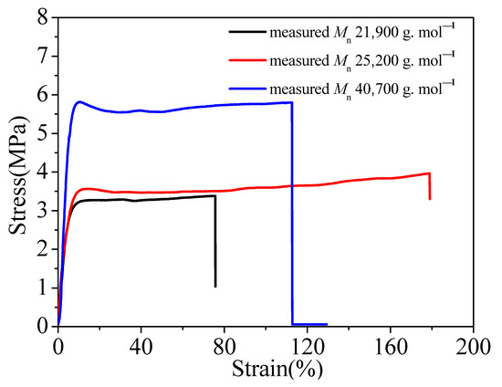 The tensile strength and the elongation of dried emulsion polymer films are shown in Figure 3. In Figure 3A, the dried emulsion polymer film with Tg = 29.9 °C exhibited the largest maximum tensile strength (over 5.0 MPa). The maximum tensile strength of the dried emulsion polymer film was increased when the Tg of the emulsion polymer was increased, but the trend was opposite for the elongation at break. Below Tg, there is insufficient energy for whole segments of the polymer chains to move; hence, the polymer film is stiff and deformation is resisted [57]. When the film is elongated at a temperature lower than Tg, a higher Tg of the tested polymer leads to higher energy, enabling whole segments to move and more outside force to elongate the polymer film. Thus, the maximum tensile strength of the dried emulsion film increased with the increase in Tg when the tested temperature was below Tg. The largest maximum tensile strength (5.39 MPa) in the polymer with Tg = 29.9 °C was higher than that of the polyacrylate polymer with Tg = 43.9 °C (2.98 MPa) in our previous paper, indicating that the styrene–acrylic emulsion has potential application in preparing materials with mechanical properties.
