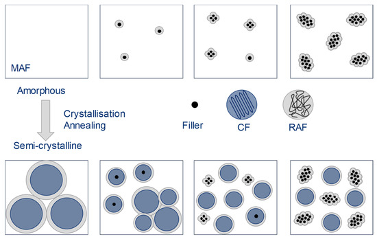 The cause of this internal structure can be a particle-particle interaction, a particle–polymer interaction, or their combination. A possible macromolecule-particle interaction must be determined in advance before its influence can be evaluated. One possible approach is to further refine semi-crystalline polymers into a two-phase model with subdivision into amorphous and crystalline phases (crystalline fraction, CF), as shown in Figure 2, far left. Wunderlich [8,9] and Schick [10] show the extension to a three-phase model. Here, the amorphous phase is divided into a mobile amorphous fraction (MAF) and a rigid amorphous fraction (RAF). The interface between the crystalline and the (mobile) amorphous region is formed by the macromolecules in the rigid amorphous fraction. Basically, it can be assumed that macromolecules cross both crystalline and amorphous regions due to their length. This can be understood as a covalent bond between the two phases. This influences the mobility of these macromolecules in a special way [11,12].