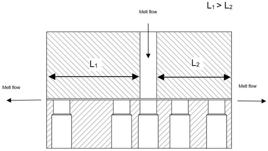 The capillary rheometer used was an R47 from Göttfert, Buchen, Germany. The melting of the plastic granules is accomplished by a connected single-screw extruder. The plastic melt is forced by the piston of the capillary rheometer through the nozzle shown schematically in Figure 3. To produce a concrete yield point, a horizontal double flat slit nozzle was used. The entry point of the melt into the nozzle is somewhat decentralized, resulting in two differently long flow paths.