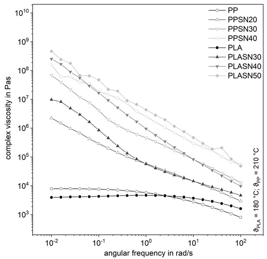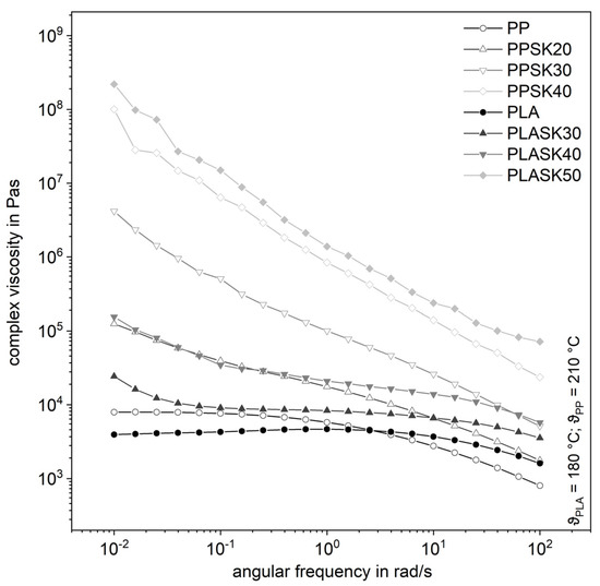 The smaller SN particles lead to higher viscosity values than the plastics filled with SK particles. This is the case for the matrix made of PLA and of PP. Thus, it can be stated that the larger total surface area of the smaller particles has a stronger influence on the flow behavior of the melt.