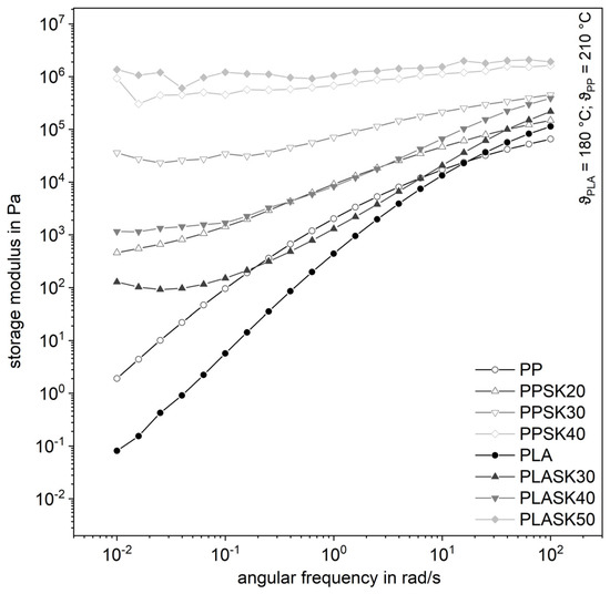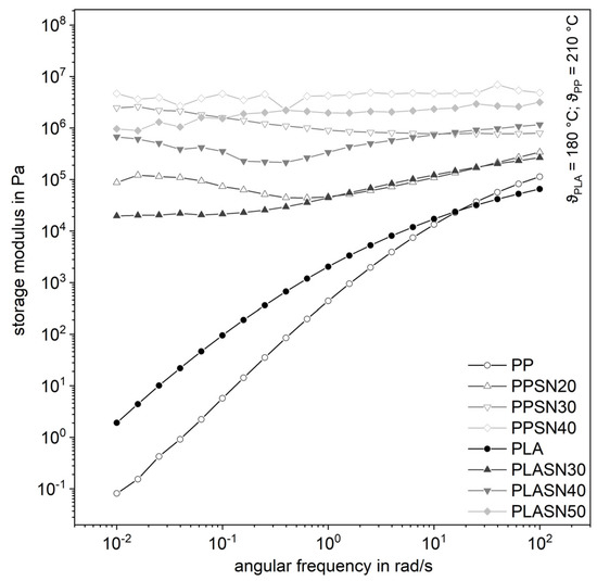 The behavior for the storage modulus in Figure 5 is even more obvious. It can be seen that the course of the storage modulus of the plastic melts with increasing filler content is independent of the angular frequency, which corresponds to the behavior of a solid. These courses can be determined equally for the two plastics. If the change in the storage modulus for low shear rates approaches zero, this indicates the formation of an internal network in the plastic [23,24]. It can, therefore, be stated that there is a formation of an inner structure in the plastic.