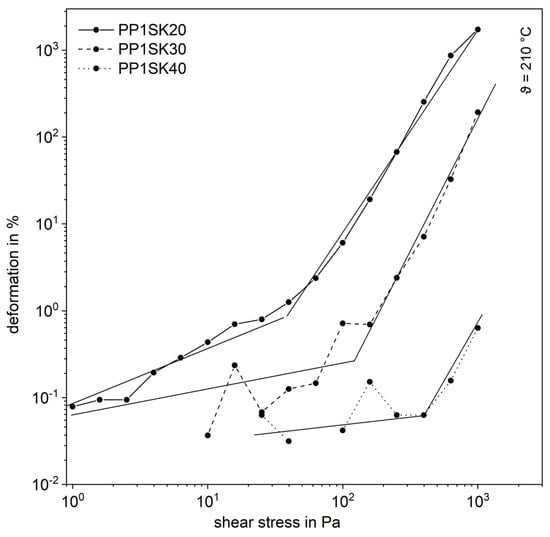 This formation of the inner structure is shown in exemplary form in a shear stress sweep of filled PP. In the range of low shear stresses, the course is linear-elastic, as can be seen in the Figure 6. Especially in this range there are strong fluctuations, because the deformations are very small and, therefore, the sensitivity of the measuring instrument reaches its limits. This is the reason why at low shear stresses there are sometimes no measured values available. For all three curves, however, a transition can be seen from which the deformation increases significantly. From this point on, the plastic melt shows a linear-viscoelastic behavior. This transition point is the yield point and is shifted towards higher shear stresses with increasing additive content. This can be traced back to the fact that the plastic melts with higher filling levels show increasingly solid-state behavior and thus behave linear-elastically. When the yield point is exceeded, the force acting from the outside is sufficient to break up the inner network [4].