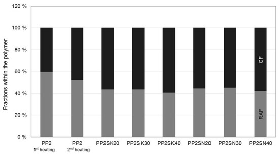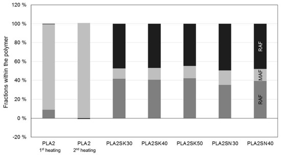 The proportion of the rigid amorphous phase in Figure 9 and Figure 10 was calculated according to Schick [10], as shown in the Introduction. A value from the NATHAS database was not used as a basis, but a value for the plastics at hand was determined in preliminary tests without additives. A division of the polypropylene into a rigid and a mobile amorphous phase cannot be determined due to the rapid crystallization. The evaluation of the individual phases can be seen in Figure 9 and Figure 10.