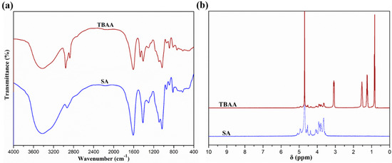 It was observed from Figure 1a that the SA displayed the main characteristic bands at 2929, 1610, and 1414 cm−1, which were respectively assigned to the C–H stretching vibration of the polysaccharide structure and the asymmetric and symmetric stretching vibration of –COO– [35]. The absorption bands at 1094, 1034, and 951 cm−1 were attributed to C–O and C–O–C stretching vibration on the polysaccharide skeleton, respectively [36]. In comparison with SA, the TBAA showed the chemical structure difference in its FT-IR spectrum, and new weak bands at 2874 and 1474 cm−1, owing to the –CH2– stretching vibration and –CH3 bending vibration of TBA+, could be observed. These results indicated the successful synthesis of TBAA intermediates through the neutralization of the alginic acid with TBAOH. In addition, it can be seen from Figure 1b that the signal peaks at 5.5~3.0 ppm were ascribed to the proton signal peaks on the alginate backbone of SA [20]. In comparison with SA, the TBAA showed new proton signal peaks at 3.10~3.00, 1.42~1.66, 1.25~1.20, and 0.86~0.80 ppm, which were classified as –CH2– and –CH3 of TBA+. This result further proved the successful synthesis of TBAA intermediates.