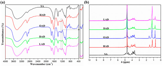 (a) FT-IR and (b) 1H NMR spectra of SA, HAD, OAD, DAD and LAD.