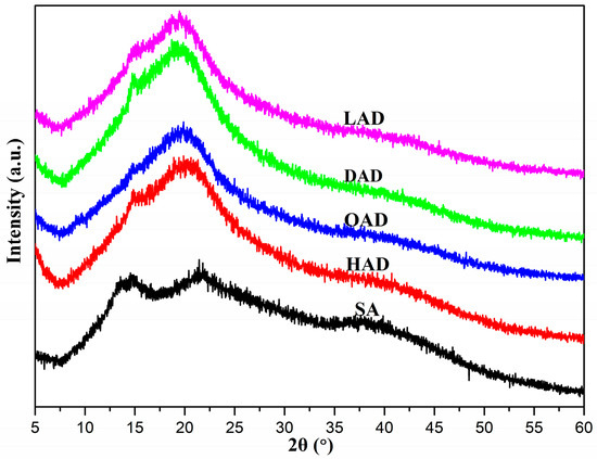 XRD is the most direct and effective method to analyze the change of crystal structures of alginate in the SN2 reaction. It can be observed from Figure 3 that SA, HAD, OAD, DAD, and LAD exhibited weak crystalline diffraction peaks, indicating their amorphous structures. The diffraction peaks of SA at around 15° and 22° were typical characteristic peaks of the hydrated crystalline structures resulting from the intramolecular hydrogen bonds of SA [38,39], but HAD, OAD, DAD, and LAD revealed a sharp diffraction peak at 2θ = 14.8° and a wider diffraction peak at 2θ = 20° after the chemical modification, which was similar to the crystal structure characteristics of alginate derivatives reported by Chen et al. [35]. By contrast, the diffraction peak of alginate decreased and became broad after the esterification modification, which showed that the microcrystalline structures of AAD had changed; therefore, the transformation of these crystal diffraction peaks for SA indirectly indicated that the esterification modification had weakened and destroyed the intramolecular hydrogen bonds of alginate, thus enhancing its molecular flexibility [7].
