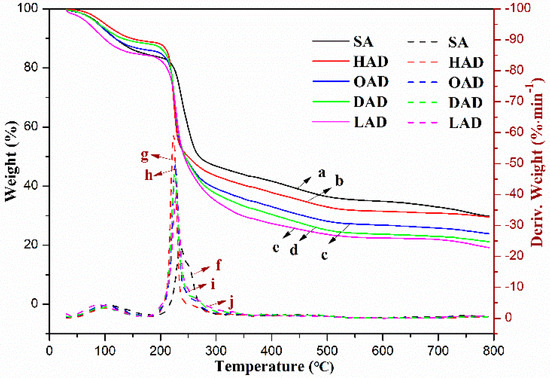Thermogravimetric analysis was utilized to estimate the different thermal stabilities of SA and HMAD, which could indirectly reflect the change of molecular structures of alginate in the SN2 reaction. It can be observed from Figure 4 that the weight losses of SA, HAD, OAD, DAD, and LAD at 800 °C were 70.2%, 70.5%, 76.1%, 78.9%, and 80.9%, respectively. Moreover, SA, HAD, OAD, DAD, and LAD displayed two main weight loss stages from their DTG curves: one was attributed to the losses of physically adsorbed water at low temperature (80~120 °C), the other was ascribed to the decomposition of polymer molecular at high temperature (200~250 °C) [40]. It can be observed that, with the increase of the carbon chain lengths of the hydrophobic side groups, the hydrophobicity of AAD is gradually enhanced, which lead to the reduction of the physically adsorbed water, thus decreasing the weight loss in the temperature range of 50~200 °C. When the temperature was gradually rising, the molecular chain of the polymer broke down and generated CO, CO2, and H2O [30,31], resulting in the rapid decrease of weight. The initiating decomposition temperatures of SA, HAD, OAD, DAD, and LAD were 237, 224, 226, 223, and 222 °C, respectively. Therefore, it was obvious that the AAD had lower thermal stability due to the decrease of the carboxyl groups of the polymer and the formation of ester bonds that destroyed the polymeric intramolecular hydrogen bond. These results further imply the esterification of alginate via the SN2 reaction was successful.