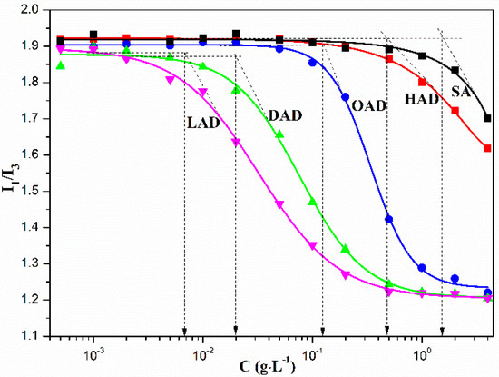 Plots of pyrene fluorescence intensity I1/I3 vs. the concentration of SA, HAD, OAD, DAD, and LAD in aqueous NaCl solution.