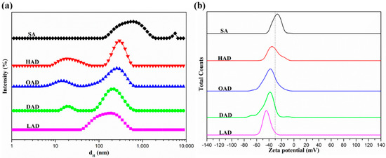 The colloidal property of AAD self-aggregated micelles was further investigated by dynamic light scattering (DLS). As shown in Figure 7a, the AAD self-aggregated micelle exhibited a narrow hydrodynamic diameter (dH) distribution in comparison with the SA aggregates. The average dH of SA, HAD, OAD, DAD, and LAD self-aggregated micelles were 570.2 nm (PDI = 0.49), 285.3 nm (PDI = 0.29), 245.0 nm (PDI = 0.36), 210.2 nm (PDI = 0.32), and 180.5 nm (PDI = 0.21), respectively. As the alkane chain increased, the average dH gradually decreased. The growth of the carbon chain length of the hydrophobic side groups enhanced the attraction between the ends of the tail, which caused strong hydrophobic associations, resulting in the reduction of dH. These results were attributed to the rigid and extended chain characteristics of SA molecules in aqueous media that led to bigger diameters for the SA aggregates [45], while the grafting of the hydrophobic side groups of the hexyl, octyl, decyl, and lauryl groups broke the intramolecular hydrogen bonds and enhanced the molecular flexibility that enabled itself to curl freely to form smaller diameters for the AAD self-aggregated micelle [35,45]. Moreover, from Figure 7b, due to the enhancement of molecular flexibility, which exposed more residual free-curling carboxyl groups on the surface, the SA, HAD, OAD, DAD, and LAD self-aggregated micelles revealed the relatively high negative zeta potential at −27.4, −44.8, −39.2, −38.3, and −34.4 mV, respectively, as a result of the presence of the negatively charged carboxyl groups [30]. The zeta potential of the AAD self-aggregated micelle was significantly lower than that of the SA aggregates, which was attributed to the fact that the AAD with both the hydrophilic main chains and hydrophobic side groups was able to self-aggregate into core-shell architectures where the hydrophilic carboxyl groups were exposed, thus reducing its zeta potential. It was reported that the self-aggregated micelle was stable in aqueous solution when its zeta potential was lower than −30 mV [7,46]. Therefore, the HAD, OAD, DAD, and LAD self-aggregated micelle could be significantly stable in aqueous solution due to the strong electrostatic repulsion that can prevent aggregation among the micelles.