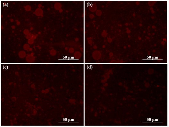 Fluorescent images of the dyed microcapsules emulsions stabilized by (a) HAD, (b) OAD, (c) DAD, and (d) LAD under dark field.