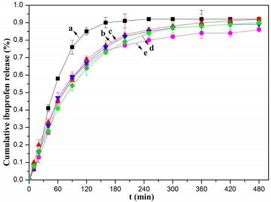 Release of ibuprofen from (a) SA, (b) HAD, (c) OAD, (d) DAD, and (e) LAD microcapsules (error bars represent the standard deviation of three replicates).