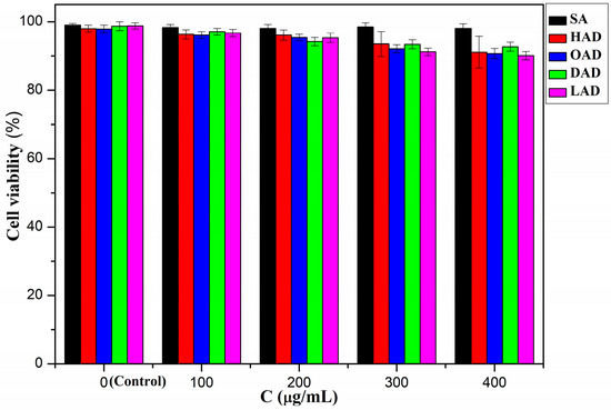 The cytotoxicity of the HAD, OAD, DAD, and LAD was evaluated on the murine macrophage RAW264.7 cell by CCK-8 assay. As shown in Figure 10, the murine macrophage RAW264.7 cell with various concentration of AAD microcapsules displayed a similar cell viability to the SA, which was close to the control, indicating that the RAW264.7 cell could be viable and proliferate well on the HAD, OAD, DAD, and LAD [50]. However, the cell viability gradually decreased with the increase of the AAD concentration, which implied that excessively high concentrations of AAD might inhibit the viability of cells. However, when the concentration of AAD was as high as 400 μg/mL, the cell viability still remained above 90% after 2 days of incubation, exhibiting good cytocompatibility of AAD. Therefore, in view of the good hydrophobic drug-loading capacity, release performance, and cytocompatibility of AAD, they can be applied to the pharmaceutical field for medical applications.