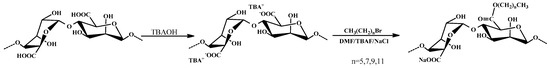 Due to the multi-functional groups of alginate, a few research strategies or methods, involving the amidation, esterification, oxidation-reductive amination, and Ugi reaction (multicomponent condensation reaction named after Ivar Karl Ugi) on the chemical modification of alginate, have been reported [13,19]. For example, Yang et al. [20] prepared the amidic alginate derivatives by the amidation reaction for their application in the microencapsulation of λ-Cyhalothrin. Yang et al. [21] synthesized cholesterol grafted alginate derivatives using N, N’-bicyclohexyl carbodiimide as the coupling agent and 4- (N, N’-dimethylamino) pyridine as the catalyst. The fluorescence analysis showed that it could self-aggregate into micelles in a solution of 0.15 mol/L NaCl, with the critical aggregation concentration (CAC) of 0.33 g/L. Kang et al. [22] performed the oxidation-reductive amination reaction to synthesize a series of alginate-derived polymeric surfactants with the linear alkyl groups. The synthesized alginate-derived polymeric surfactants presented colloidally stable aggregates with a unimodal size distribution. Fang et al. [23] performed the Ugi reaction to prepare an amphiphilic alginate derivative, which was applied to stabilize Pickering emulsion for hydrophobic drug delivery. In general, the hydroxyl and carboxyl functional groups are very susceptible to forming intramolecular hydrogen bonds within the molecules, which gives rise to the fully stretched rigid skeleton structure of alginate chains and decreases the reactivity. Consequently, most chemical modifications require coupling agents and catalysts, including perchloric acid [24], 1-ethyl-3- (3-dimethylaminopropyl) carbodiimide hydrochloride (EDC·HCl) [20], 4- (N, N’-dimethylamino) pyridine [21], and 2-chloro-1-methylpyridinium iodide (CMPI) [18], to activate hydroxyl or carboxyl groups to improve the reactivity. However, a few previous works [25,26,27] have proposed a method for the chemical modification of alginate without the aid of a catalyst. This method mainly contains two processes: the neutralization of the alginic acid with tetrabutylammonium hydroxide (TBAOH) and its subsequent bimolecular substitution nucleophilic (SN2) reaction, illustrated in Scheme 1. Recently, Pawar et al. [28,29] improved this method with some modifications that increased the degree of substitution (DS) for alginate derivatives. They provided a strategy to dissolve tetrabutylammonium alginate (TBAA) in polar aprotic solvents with the presence of a dissolution promoter, such as tetrabutylammonium fluoride (TBAF), so that the esterification of TBAA could be achieved under homogeneous conditions via bimolecular substitution nucleophilic (SN2) reactions. The results showed that the resultant alginate ester derivatives could exhibit high chemical activity, with a DS close to 1.0. Although Pawar et al. [29] used TBAF-based two component solvent systems as media for the chemical modification of alginate via the SN2 reaction under homogeneous conditions, they only synthesized benzyl, butyl, ethyl, and methyl alginate esters as matrix polymers for the amorphous solid dispersion (ASD) of drugs. Research on the chemical modification of alginate using alkyl bromides with different lengths of carbon chain as the hydrophobic modifiers under homogeneous conditions via the SN2 reaction, especially the characterization, amphiphilic properties, self-aggregation behavior of the alginate ester derivatives, and the effects of the alkyl groups with different length of carbon chain (hexyl, octyl, decyl, and lauryl groups) on the physicochemical properties of the alginate ester derivatives, have been rarely reported so far. Furthermore, amphiphilic alginate ester derivatives could form micelle-like aggregates in aqueous media, so they could be widely used in encapsulating hydrophobic drugs for the development of hydrophobic pharmaceutical formulations for biomedical application.