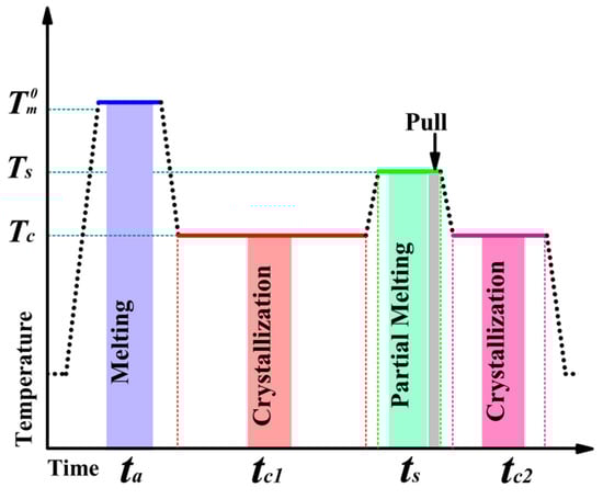 According to the previous report by Varga [45,46], when the fiber was pulled through a polymer melt, the whole fiber was surrounded by cylindrites during the subsequent isothermal crystallization. However, in our fiber-pulling experiment, the cylindrites were observed only on the fiber surface that was pulled out from the structured melt zone. Two reasons were considered for this result. One was that the fiber-pulling rate employed in our experiment was very low and could not induce the formation of stable nucleation at 170 °C for the supercooled melt. The other, maybe the most important one, was that the surviving structure after partial melting in the structured melt could be relocated along the fiber-pulling direction even under such a low pulling rate and grew eventually into cylindrites as nucleation precursors.