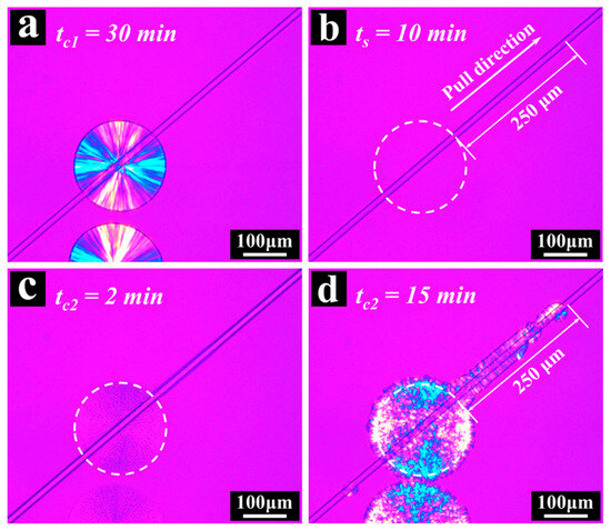 Figure 2 showed the selected optical micrographs of crystalline morphology and structure obtained at different stages during the fiber-pulling experiment. In Figure 2a, the selected spherulite, penetrated through the center by a single fiber, was observed after isothermal crystallization at 135 °C for 30 min, with a diameter of ca. 160 μm. When the temperature was increased up to 170 °C and kept for 10 min, the birefringence disappeared completely. The zone where the spherulite was located previously was regarded as the structured melt zone in this work and was circled by a dashed line, as shown in Figure 2b. Then, a shear flow was generated by the fiber pulling at 62.5 μm/s over 250 μm along the direction marked in Figure 2b. Subsequently, the sample was cooled down to 135 °C again for isothermal crystallization. As shown in Figure 2c, the spherulite recovered in the previous location quickly. It should be noted that the fiber, of 250 μm in length, that was pulled out from the structured melt zone at 62.5 μm/s was covered with small crystals. On the other hand, no observed crystals were found on the fiber that was pulled out from outside the structured melt zone (denoted as the supercooled melt zone in this work). After isothermal crystallization at 135 °C for 15 min, cylindrites with a length of 250 μm were observed on the fiber, as shown in Figure 2d. At the same time, only a few isolated spherulites were found along the fiber that was pulled out from the supercooled melt zone. In addition, the recovered spherulite in the original zone was optically positive, as discussed by Yan [44].