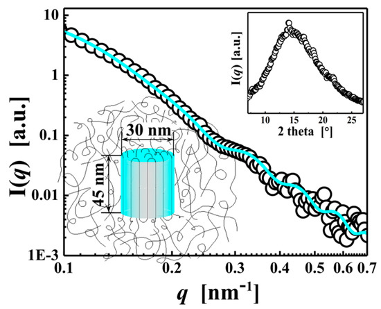 The SAXS scattering profile of iPP, obtained at 170 °C for a holding time of 10 min. The best fit (solid line) is also shown. The corresponding simultaneous WAXS profile and diagrammatic sketch for cylindrical nanocrystals are shown at the right top and left bottom as inset, respectively.