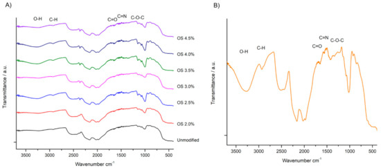 (A) ATR-FTIR spectra of native starch and oxidized starch with different degrees of substitution and (B) spectra of the film with plasticizers, formulation 6.