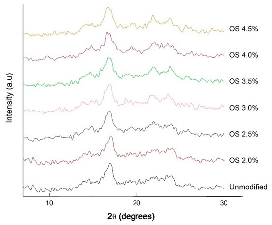 The X-ray diffraction patterns in Figure 4 show that NS has characteristic peaks at 2ϴ = 14°, 2ϴ = 17°, 2ϴ = 19°, 2ϴ = 21°, and 2ϴ = 23° corresponding to a typical semicrystalline solid structure with B-type crystallinity typical for tuber starches. This structure can be interpreted as having hexagonal symmetry due to amylopectin-hydrated double helix packing [44]. OS at different extensity of modification also presents a semicrystalline structure, with similar peaks at 2ϴ = 14°, 2ϴ = 17°, 2ϴ = 19°, 2ϴ = 22°, and 2ϴ = 24°. The diffraction peak at 2ϴ = 18° is in good agreement with Zobel [45], who reported that B-type crystallinity has a peak at 2ϴ = 18°, whereas the peak at 2ϴ = 21° is related to the presence of complexes between the amylose and the lipids [46]. On the other hand, according to Rivas-González et al. [47], the chemical modifications do not affect the diffraction pattern, but instead the percentage of crystallinity of the starch, since extensity of modification tends to take place first in the amorphous phase and last in the crystalline phase. It should be noted that the degree of crystallinity is directly related to the amount of amylopectin, while the amorphous phase is related to the amylose that this polymer contains. The importance of characterizing starch is based directly on its possible application for the food industry.
