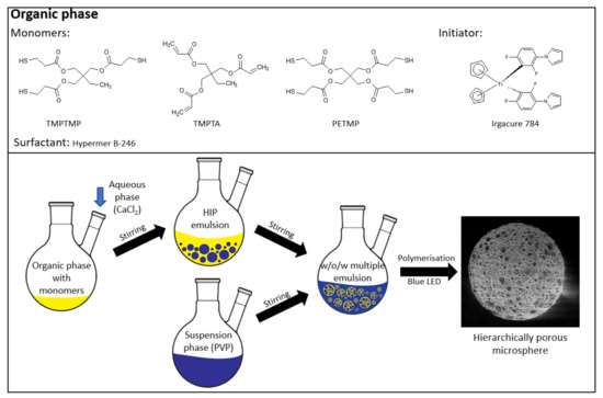 To prepare highly porous polyHIPE microspheres in an efficient batch approach, a multiple emulsion system was used. This approach was already used [24]; however, the synthesis of microspheres with a fully open porous surface using this method tends to be challenging as many factors affect the results. Therefore, great emphasis was placed on the preparation of microspheres with a fully interconnected porous structure and open surface. Thiol-ene photopolymerization was chosen as the polymerization mechanism as it has been shown to be efficient for the preparation of porous monolithic polyHIPE materials [32,33]. The polymerization scheme of the synthesized microspheres is shown in Figure 2.