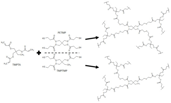 The samples are labeled based on the thiol used (A for PETMP and B for TMPTMP), while the numbers represent the thiol to double-bond content (1 is 1:1; 2 is 1:2; 3 is 1:3).