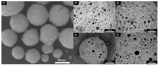 It needs to be emphasized that all of the prepared microspheres had an open porous structure on both the surface and the inside, which is well-visible from the SEM images (Figure 4). The main difference between the surface and inner morphology is the amount of pores present on the surface and the interconnectivity, which is slightly lower on the surface. This could be due to the interactions between the suspension phase and the internal phase of the HIPE (both are composed of water), which affect the surface morphology. Although there was a slight difference in the microsphere diameter between trithiol and tetrathiol, interestingly, the cavity and window diameters of the microsphere surface were approximately the same. However, while the cavity diameter of the surface did not differ significantly, the cavity diameter of the cross-section was larger in the case of TMPTMP-based microspheres, especially in sample B1, which had cavities approximately three times larger than any of the PETMP-based samples (Table 4). This is most likely due to the difference in the HIP emulsion stability, which seems to be larger for tetrathiol. Additionally, by adding higher acrylate content, the cavity diameter of the cross-section in trithiol decreased from 30.0 to 16.1 (B2) and 13.4 μm (B3), indicating that the acrylate content influences the HIPE stability in the trithiol system and, therefore, the cavity diameter.