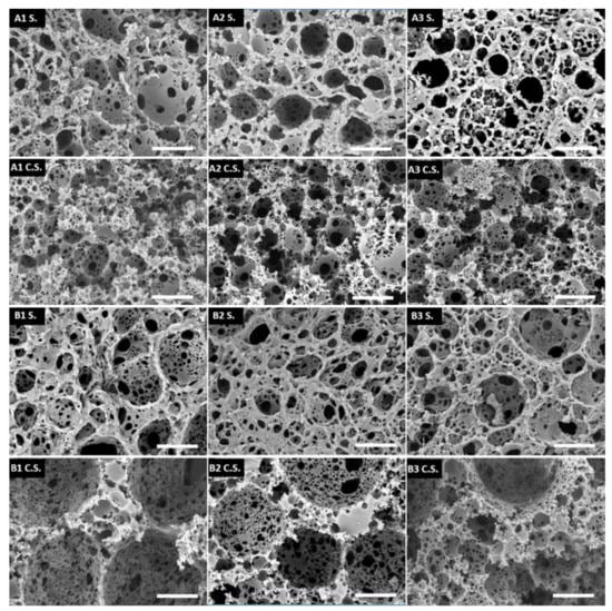 SEM pictures of the surface morphology (S) and the cross-section morphology (C.S.). The scale bar represents 20 μm.