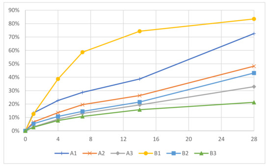 In addition to the effect on the morphology, the acrylate content considerably influenced the degradation speed, as it decreased with increased acrylate content, which is shown in Table 5. Samples A1 and B1 had considerably higher degradation rates compared to the samples with higher acrylate content. A1 and B1 had degradation degrees of 72.6% and 83.5% at 28 days, respectively; while A2, A3, B2, and B3 had degradation degrees of 48.2%, 32.9%, 43.1% and 21.3%, respectively. The degradation of most samples increased steadily up to 28 days, with the exception of B1 (Figure 5). Sample B1 had a decrease in its degradation rate in the later stages, as it only increased by 9.1% between 14 and 28 days. This plateau-like effect is probably due to the fast degradation of the thioester bonds, which resulted in a slower degradation in the later stages as fewer degradable bonds were left at the end. It was demonstrated that by varying the acrylate content, it is possible to control the degradation degree. This was also shown by Rydholm et al. [36].
