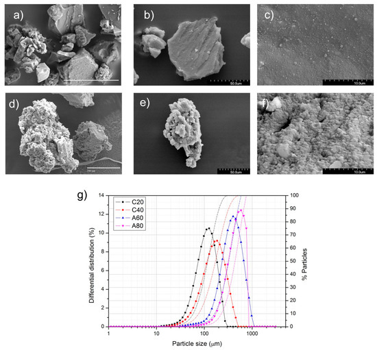 SEM images of the ELT particles obtained through (a–c) cryogenic grinding (sample C20) and observed at low (a,b) and high (c) magnification; SEM images of the ELT particles obtained through (d–f) ambient grinding (sample A60) and observed at (d,e) low and (f) high magnification; (g) differential particle size distribution (left axis) and cumulative particle size distribution (right axis) of the used ELT particles.