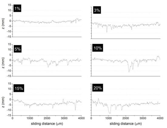 Figure 3 shows the surface profiles (z, in mm) of the friction test carried out for the different pad elements prepared with the A60 ELT rubber particles at different concentrations. These profiles correspond to an average value measured on four positions (at 0, 90, 180 and 270 degrees) perpendicular to the sliding direction. From the topography of the curves shown in Figure 3, it can be inferred the removal of some material during friction test occurred and, in some cases, ripped particles out of the friction surface. It is nevertheless clear that the material removal increased with the rubber concentration in the pad element, as a result of the low wear resistance of such particles.
