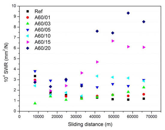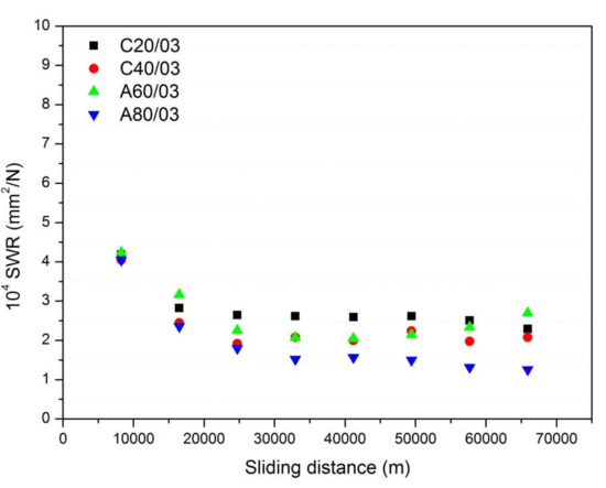 The SWR values calculated from the weight losses presented above and by using Equation (2) are shown in Figure 6. The general trend is similar to the ones observed in Figure 4 for composite pad elements with rubber concentrations below 10%. Here, it was observed that except for the first 16,000 m, the SWR was practically constant, indicating a good stability of the friction properties of the composites. The smallest SWR values corresponded to the composite pad elements with rubber particles of below 650 µm (A80), while the higher were obtained for those with particle size of <200 µm and independent of the grinding process. This result is similar to Chang’s [19] work, which found an increase in SWR values as the particle size decreased and which attributed the observed behavior to the higher formation of wear debris in those pads prepared with the smallest particle size. In the prepared composite pad elements, the lower interaction of the rubber particles with other pad components may cause this higher SWR and therefore, in the same line, higher rubber concentrations or lower particle sizes lead to higher SWR.